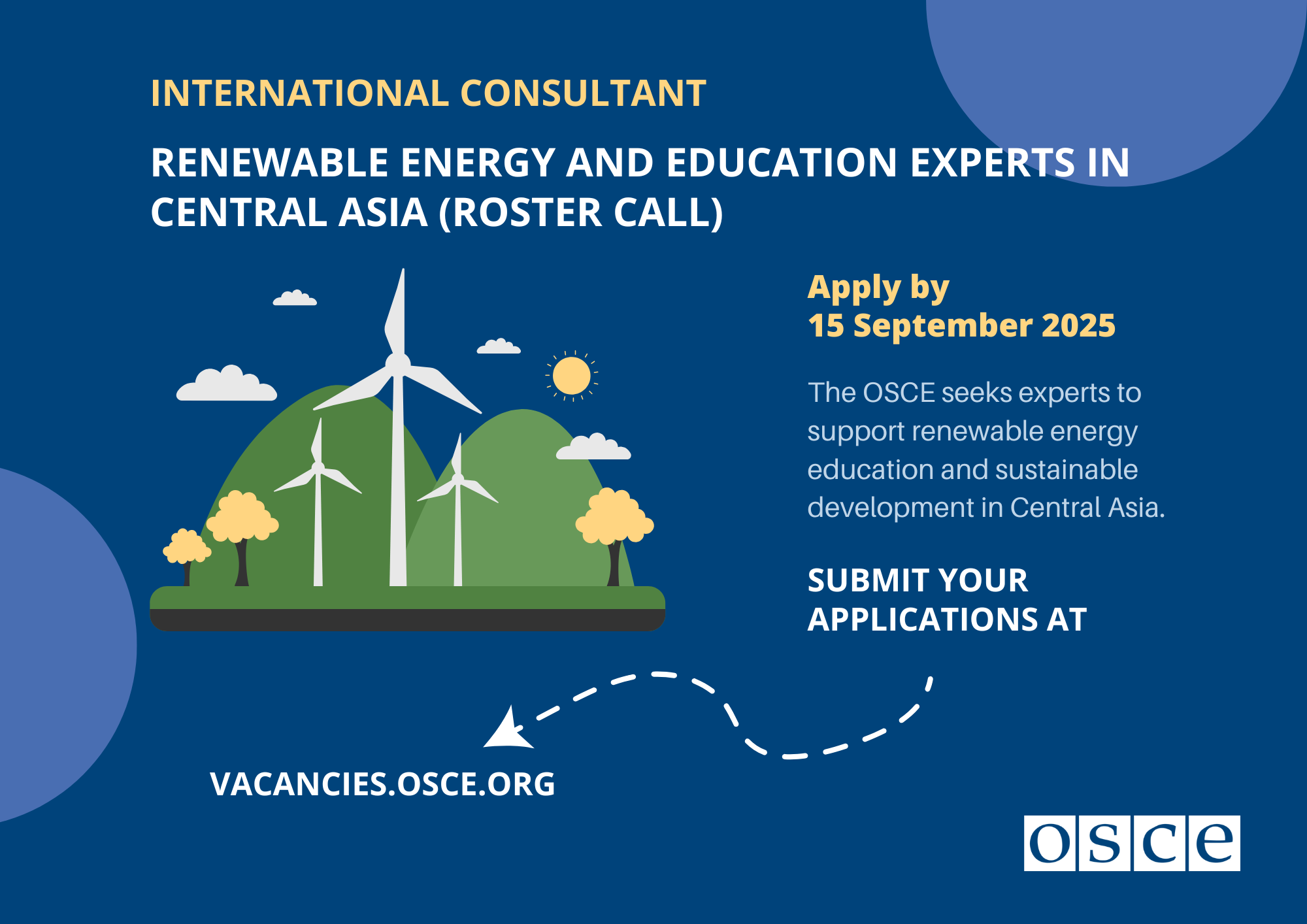 The Organization for Security and Co-operation in Europe (OSCE) has announced the formation of an expert roster for the position of International Consultant on Renewable Energy and Education in the countries of Central Asia.