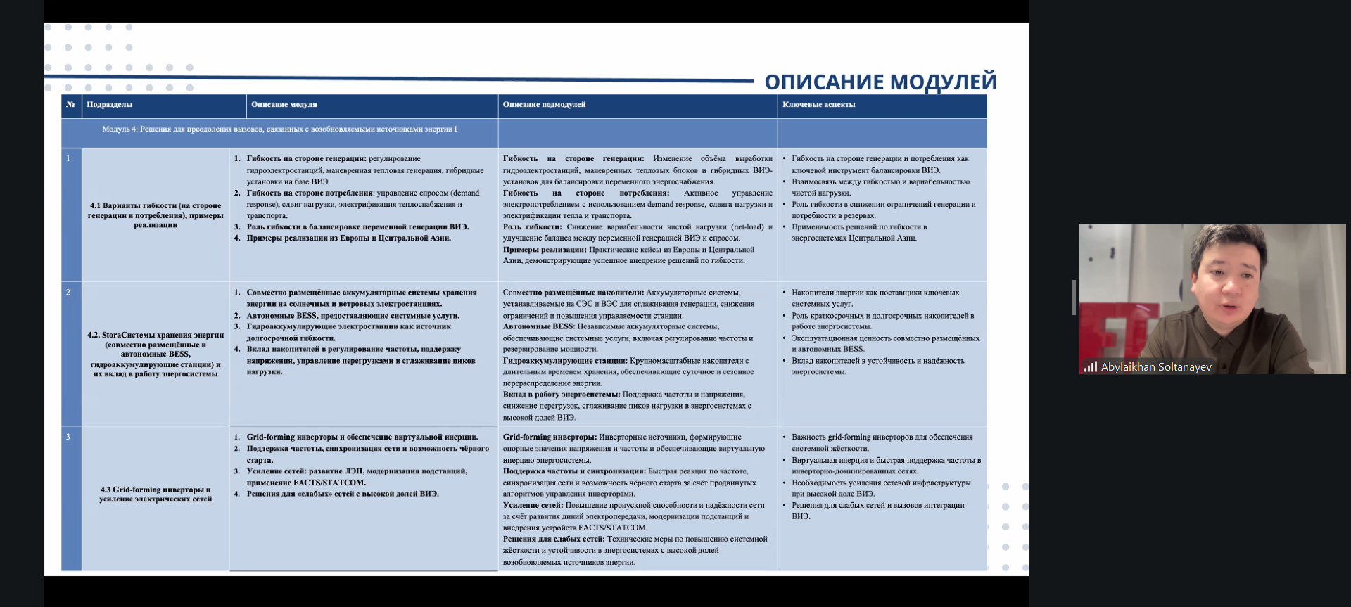 Project experts outlined the academic concept of the course, emphasising that it will equip students not only with theoretical knowledge, but also with practical tools and modelling skills relevant to modern power system challenges. The course will introduce students to digitalisation, forecasting tools, grid stability issues, sector coupling solutions, and international best practices, while remaining grounded in the specific operating conditions of Central Asian energy systems.