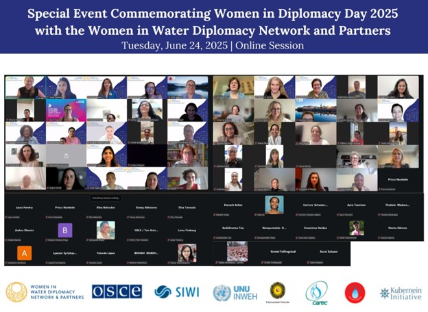 Online Women in Water Diplomacy Day on June 24: " Despite their undeniable contributions, women continue to face barriers and inequalities in leadership and decision-making spaces, including in diplomacy. The representation of women in key diplomatic roles, such as negotiators and mediators in peace processes, remains low. The observance seeks to address those challenges and to emphasize the importance of women’s leadership in political decision-making processes. The second annual online event to mark the International Day of Women in Diplomacy brought together +100 water diplomats, experts and other stakeholders. The session was organized by Elizabeth A. Koch and the Network's Global Leadership Council members including representatives of the Central Asian Women in Water Management Network with the support of co-convening partners at the The United Nations University Institute for Water, Environment and Health (UNU-INWEH), the OSCE - Organization for Security and Cooperation in Europe, The Regional Environmental Centre for Central Asia (CAREC), the Netherlands Institute for Human Rights, Platform on Peace Security and Human Rights Universiteit Utrecht, Kubernein Initiative, the Stronger Together Coalition of women-led water networks and SIWI - Stockholm International Water Institute.