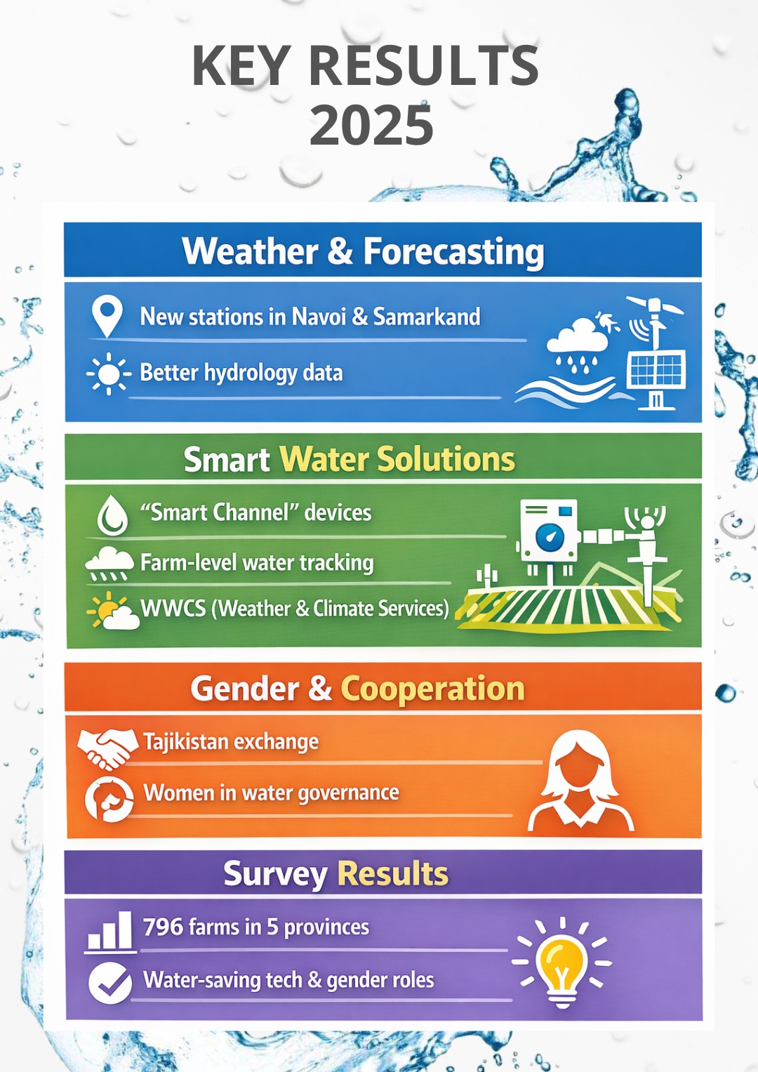 - Hydrometeorological modernization: installation of new weather stations in Navoi and Samarkand regions and integration of data into the national hydrometeorological network; enhancement of hydrological forecasting tools.