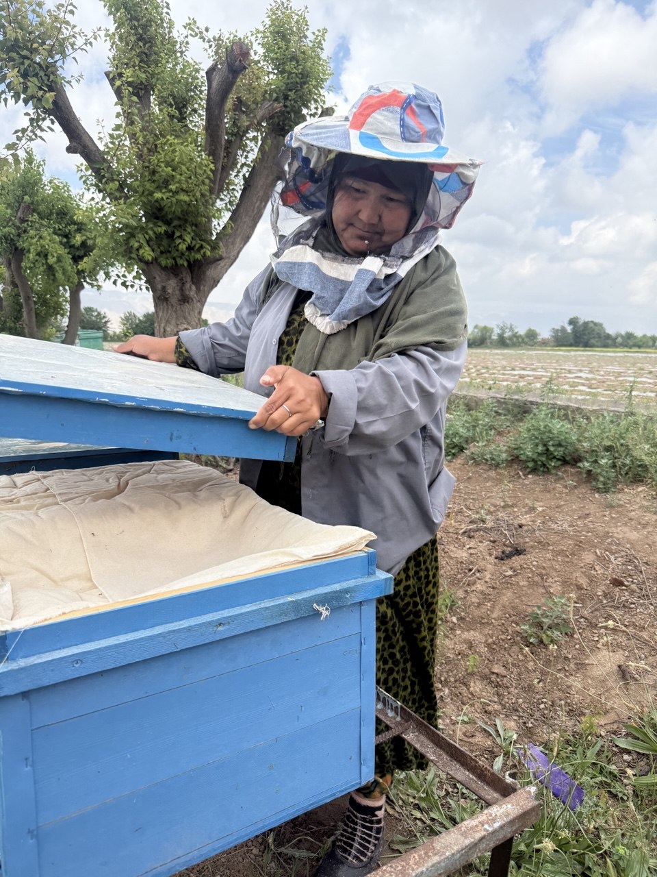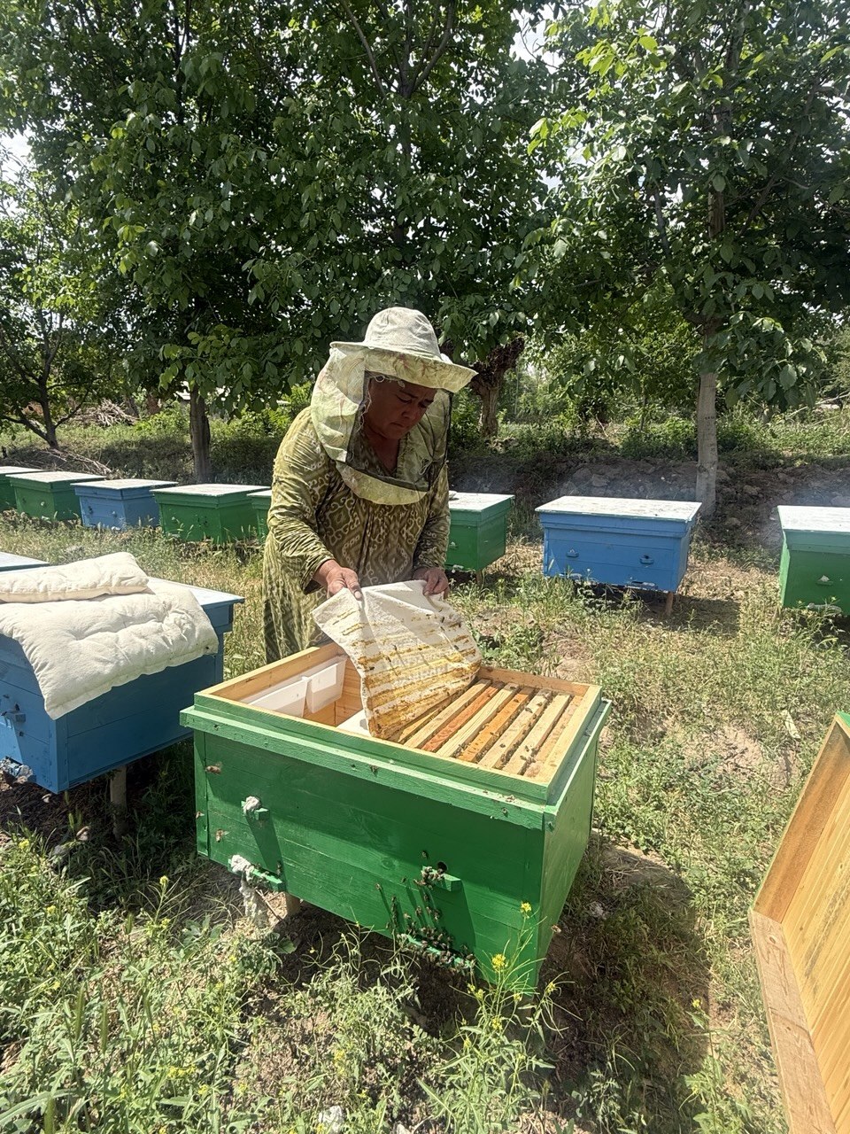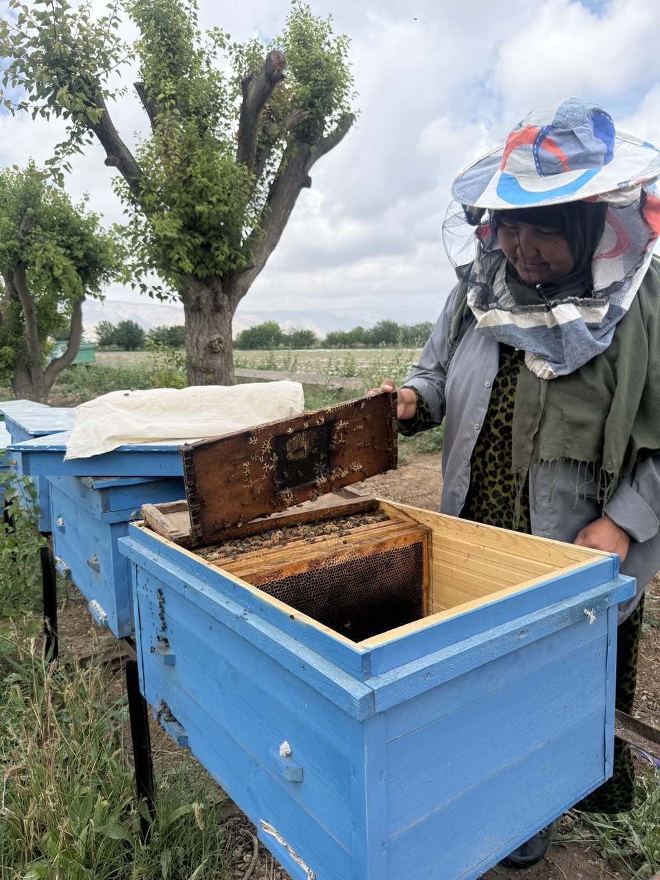 Another example is Juraeva Savrinisso, 55, a mother of three from the village of Oltinsoy. In 2025, she received 30 bee colonies and harvested around 20 kg of honey in the same year. Part of the honey is used for family needs, part to support vulnerable households, and part for feeding the bees.