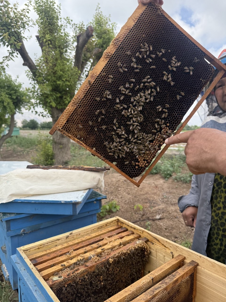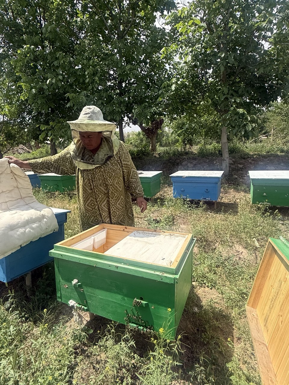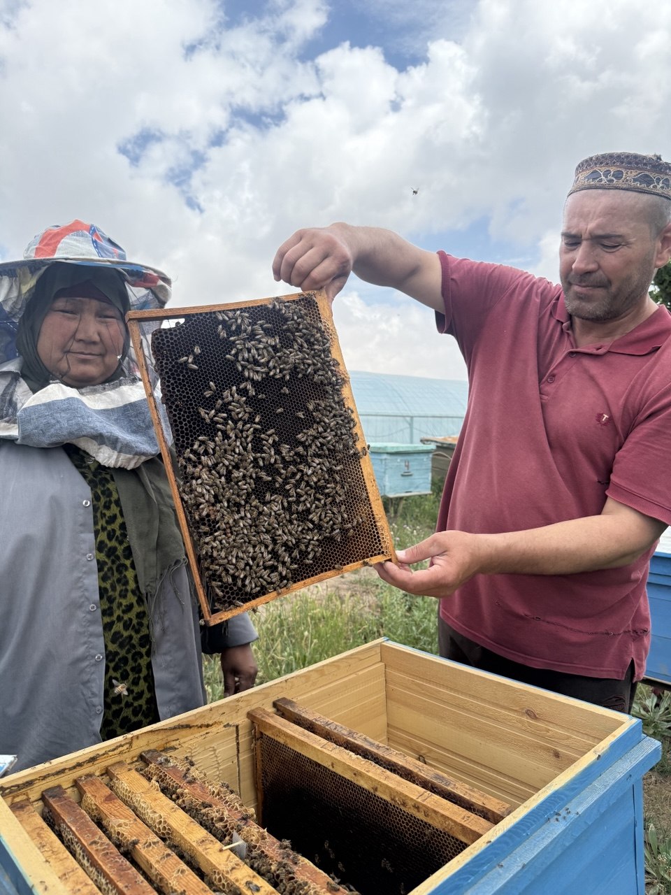 The family also places strong emphasis on supporting others. Alisher shares bee colonies with neighbors and relatives and helps vulnerable families. For example, he provided bees to a low-income family with three children and continues to support them by offering hands-on training during the first years.