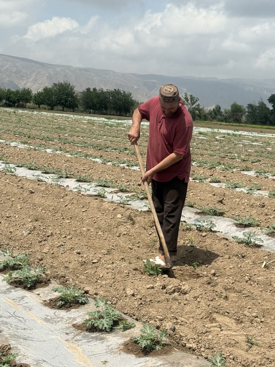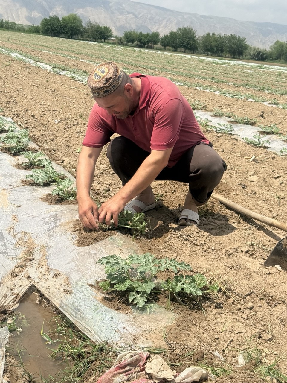 The crops are grown under plastic covering, which allows for early harvesting. The first harvest is sold per piece, with prices ranging from 18 to 25 somoni per watermelon, depending on market conditions.