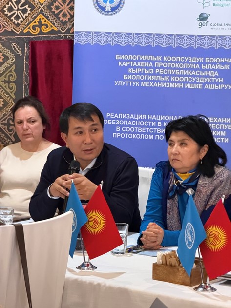 Он подчеркнул, что проект помогает устранить ключевые барьеры в сфере биобезопасности - отсутствие согласованной нормативно-правовой базы, недостаточный кадровый потенциал и ограниченную доступность информации о возможных последствиях использования ГМО. По его словам, проект способствует укреплению национальной системы биобезопасности, улучшению межведомственной координации, созданию необходимых административных механизмов, включая лаборатории по выявлению ГМО, а также повышению компетенций специалистов. Особое внимание он уделил необходимости завершения разработки нормативно-правовых актов, обеспечивающих реализацию Закона «О биологической безопасности в Кыргызской Республике».