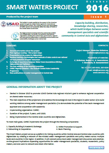 With a great pleasure, we present to you the first newsletter of the USAID-CAREC Smart Waters project, which contains general information about the project and its fundamental development steps since the beginning of this year.