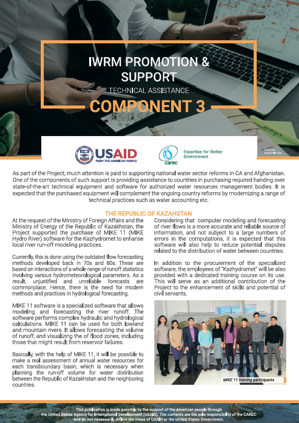 As part of the Project, much attention is paid to supporting national water sector reforms in CA and Afghanistan. One of the components of such support is providing assistance to countries in purchasing required handing over state-of-the-art technical equipment and software for authorized water resources management bodies. It is expected that the purchased equipment will complement the ongoing country reforms by modernizing a range of technical practices such as water accounting etc.