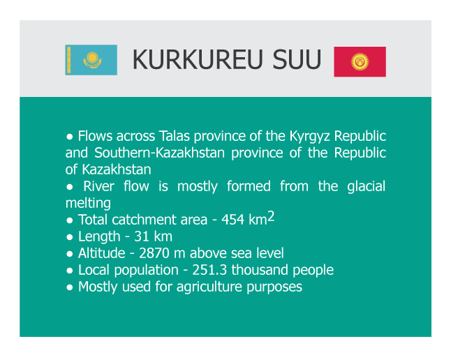 SBC of Kurkureu suu River was established in 2016. The main purpose of SBC is to bring together all the stakeholders for the rational use of water resources and facilities based on the use of integrated water management principles. It should be noted that one of the most difficult problems is a poor water supply from the river flow in some areas of the basin and the lack of proper monitoring. In this regard, the process of basin planning in the Kazakh part of Kurkureu suu river basin continues as well as trainings for SBC members.