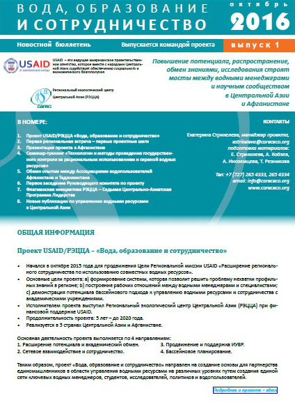 С большим удовольствием представляем вашему вниманию первый новостной бюллетень проекта USAID/РЭЦЦА «Вода, образование и сотрудничество», который содержит основную информацию о данном проекте, а также его фундаментальных шагах развития с начала этого года.