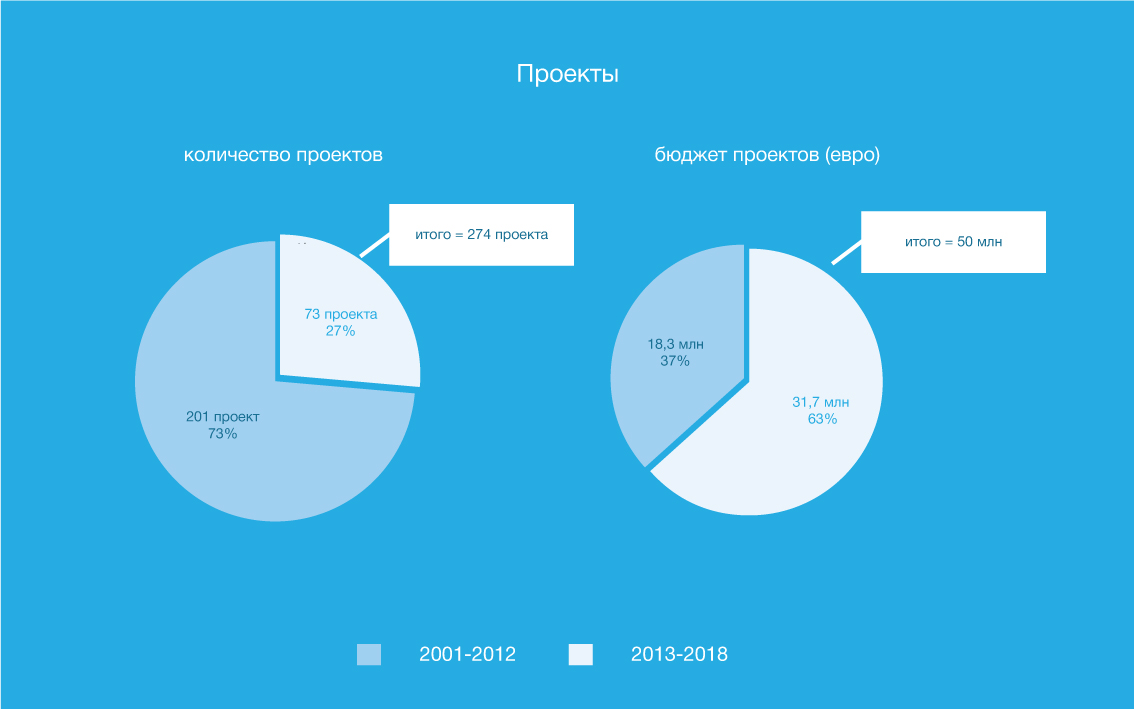 Стоит также отметить, что за 6 лет существенно изменился портфель проектов РЭЦЦА: от большого количества проектов с маленьким бюджетом центр перешел к реализации масштабных проектов. За прошедший период при поддержке партнеров по развитию и национальных партнеров РЭЦЦА приступил к реализации нескольких мега-проектов: CAMP4ASB, Smart Waters, UzWAterAware, CAWECOOP (завершился в 2017), Nexus, Blue Peace Central Asia. Данные проекты формируют 87% бюджета РЭЦЦА за 2013-2018 годы.