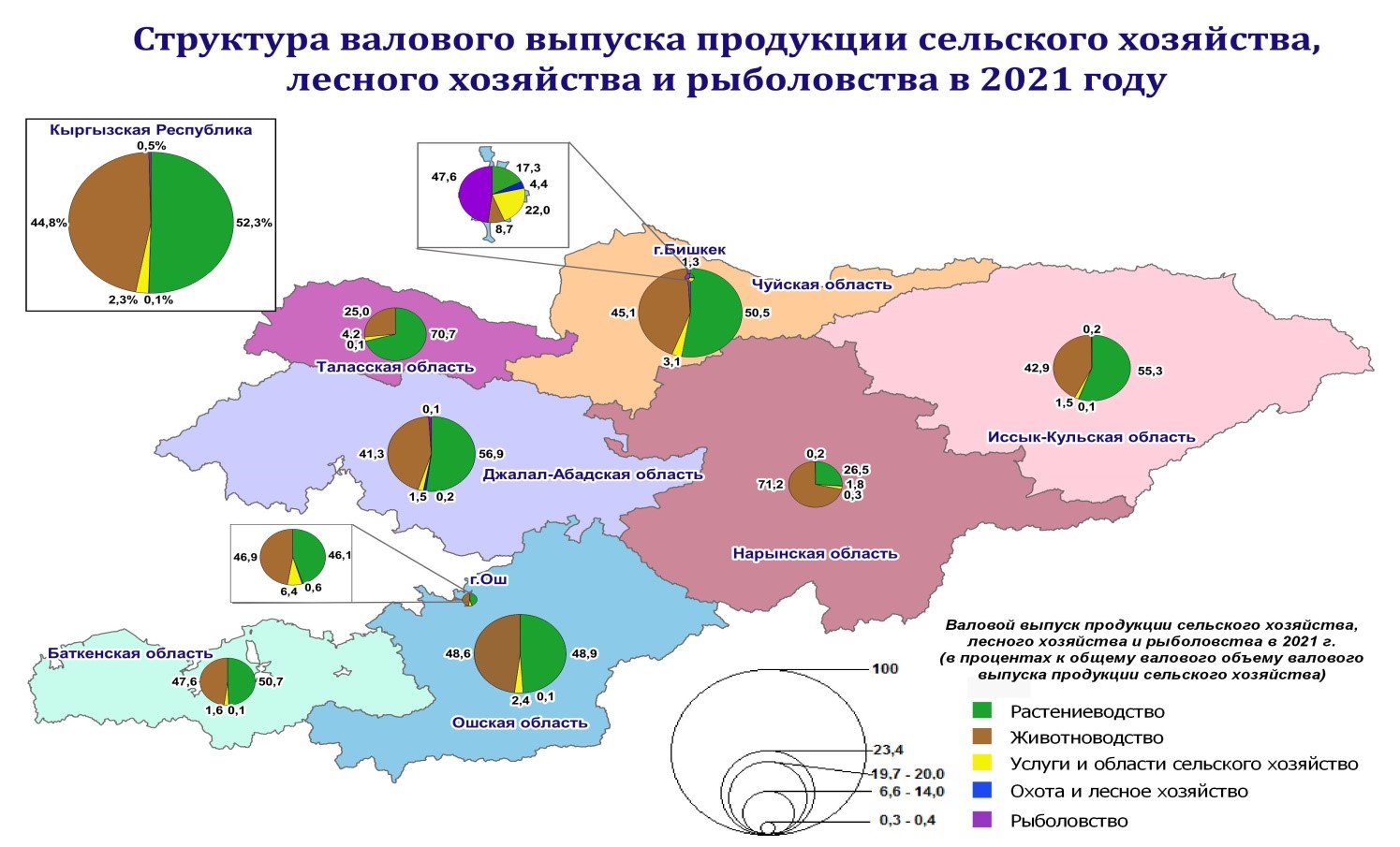 Площадь земельного фонда по видам сельскохозяйственных угодий распределена следующим образом: пастбища занимают 85% (9 млн. га), пашни 12% (1,2 млн. га), сенокосы 1,9 % (204 тыс. га), многолетние насаждения 0,7% (77 тыс. га), залежи 0,3 (34,7 тыс. га.). Наибольший удельный вес в общем объеме валового выпуска продукции сельского хозяйства, лесного хозяйства и рыболовства в 2021 году приходился на хозяйства Чуйской (23,4%), Джалал-Абадской (20%), Ошской (19,7%), Иссык-Кульской (14%) и Таласской (8,9%) областей.