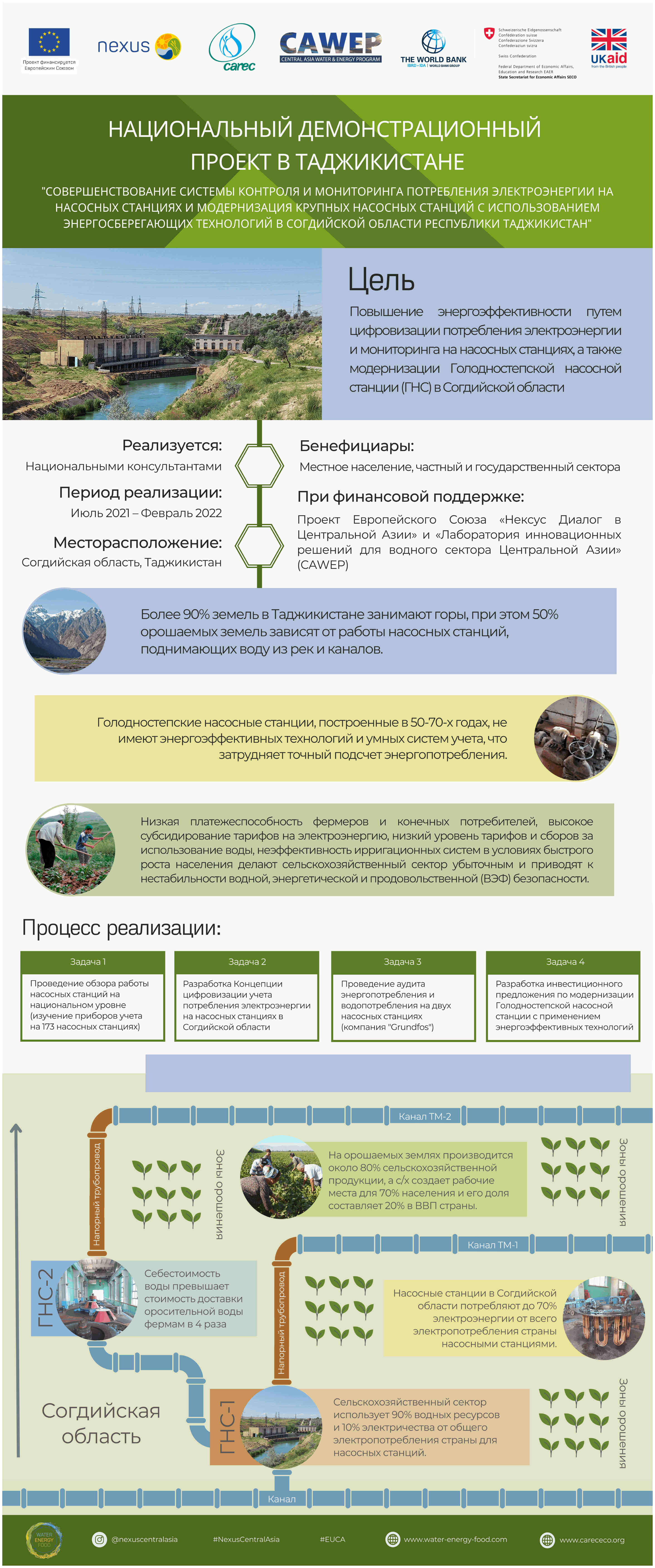 Национальный Нексус демо-проект в Таджикистане «Совершенствование системы мониторинга энергопотребления на насосных станциях и разработка предложений по модернизации крупной насосной станции на основе применения энергоэффективных технологий в Согдийской области Республики Таджикистан» нацелен на повышение энергоэффективности насосных станций в Согдийской области Таджикистана. В настоящее время в рамках проекта достигнуты следующие результаты: