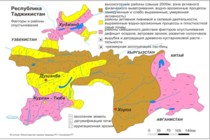 Несмотря на богатство водных ресурсов и высокую увлажненность ряда районов, часть территории Таджикистана занимают пустыни. Сюда относятся до 40-50% Восточного Памира, небольшие площади (30-40 тыс. га) южного и северного Таджикистана в низовьях рек Пяндж, Вахш, Кафирниган и Сырдарья (рис. 1). Естественное опустынивание прослеживается во многих природных зонах, что связано с положением Таджикистана среди крупных пустынь евроазиатского континента: пустынь Гоби, Такламакан, Каракумы и Кызылкум.