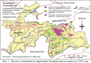 В настоящее время происходит сокращение оледенения Таджикистана, т.е. уменьшение площади и объема его ледников, что, весьма вероятно, объясняется повышением общего температурного фона и изменением характера выпадения осадков, переносимых пыльными бурями. Деградация оледенения наблюдается на ледниках Зеравшана, Гиссаро-Алая, Памира и даже Гиндукуша (рис. 2). Специалисты это связывают с изменением климата. Но говоря об изменении климата, чаще всего имеют в виду таяние ледников и уменьшение осадков в горах. Но не менее важная проблема, связанная с изменением климата – участившиеся в стране пыльные бури. К сожалению, пыльная мгла отодвигается на задний план первостепенных задач в борьбе с изменением климата.