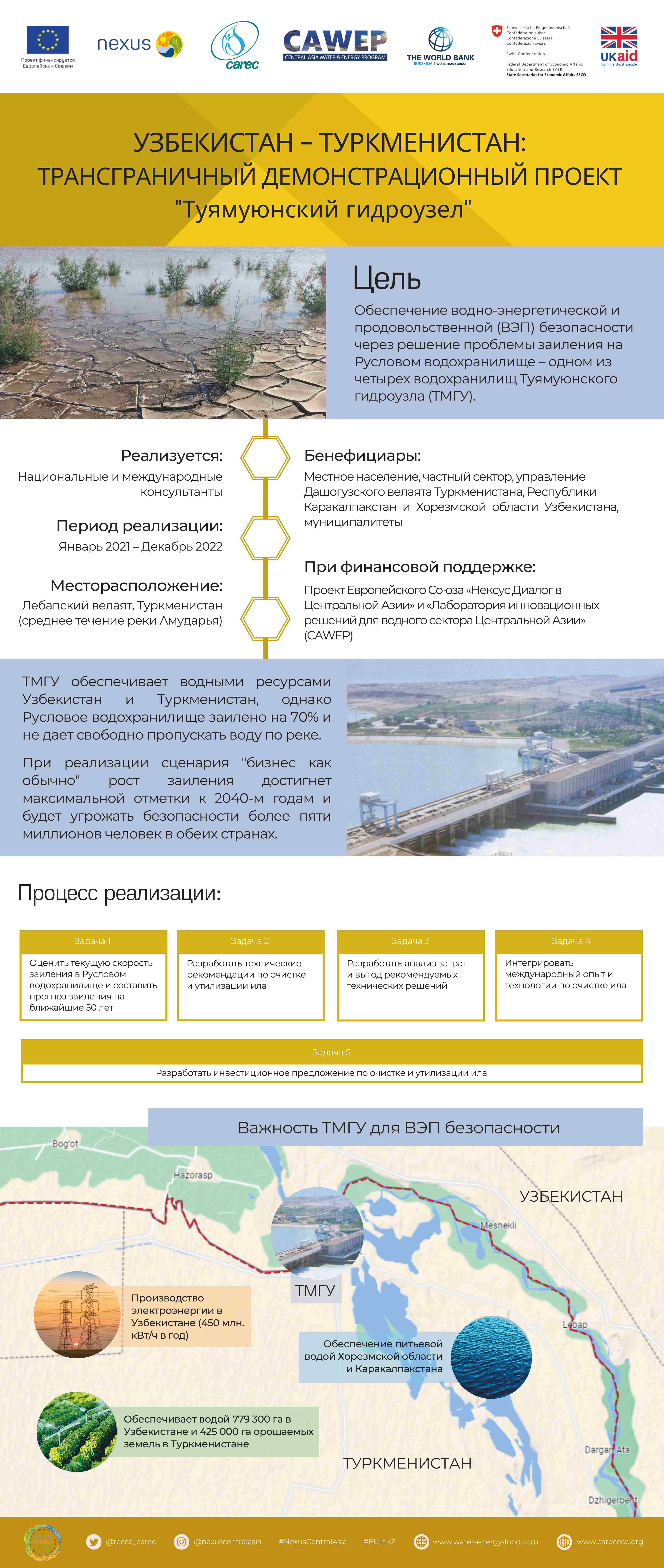 Трансграничный Нексус демо-проект между Узбекистаном и Туркменистаном «Туямуюнский гидроузел» нацелен на поддержание ВЭП-безопасности путем решения проблемы заиления Руслового водохранилища ТМГУ. На данный момент в рамках проекта достигнуты следующие результаты: