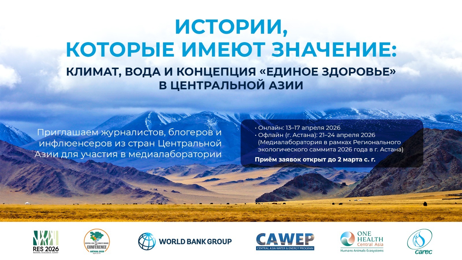 Водно-энергетическая программа для Центральной Азии (CAWEP), администрируемая Всемирным банком, совместно с Региональным экологическим центром Центральной Азии (РЭЦЦА) в рамках проекта «Единое здоровье» - инициативы, направленной на предотвращение эпидемий, обеспечение жизнестойкости продовольственных систем и здоровья экосистем в Центральной Азии - объявляют о проведении медиалаборатории (Media Lab) для журналистов, блогеров, и лидеров общественного мнения (инфлюенсеров) из Республики Казахстан, Кыргызской Республики, Республики Таджикистан, Туркменистана и Республики Узбекистан.