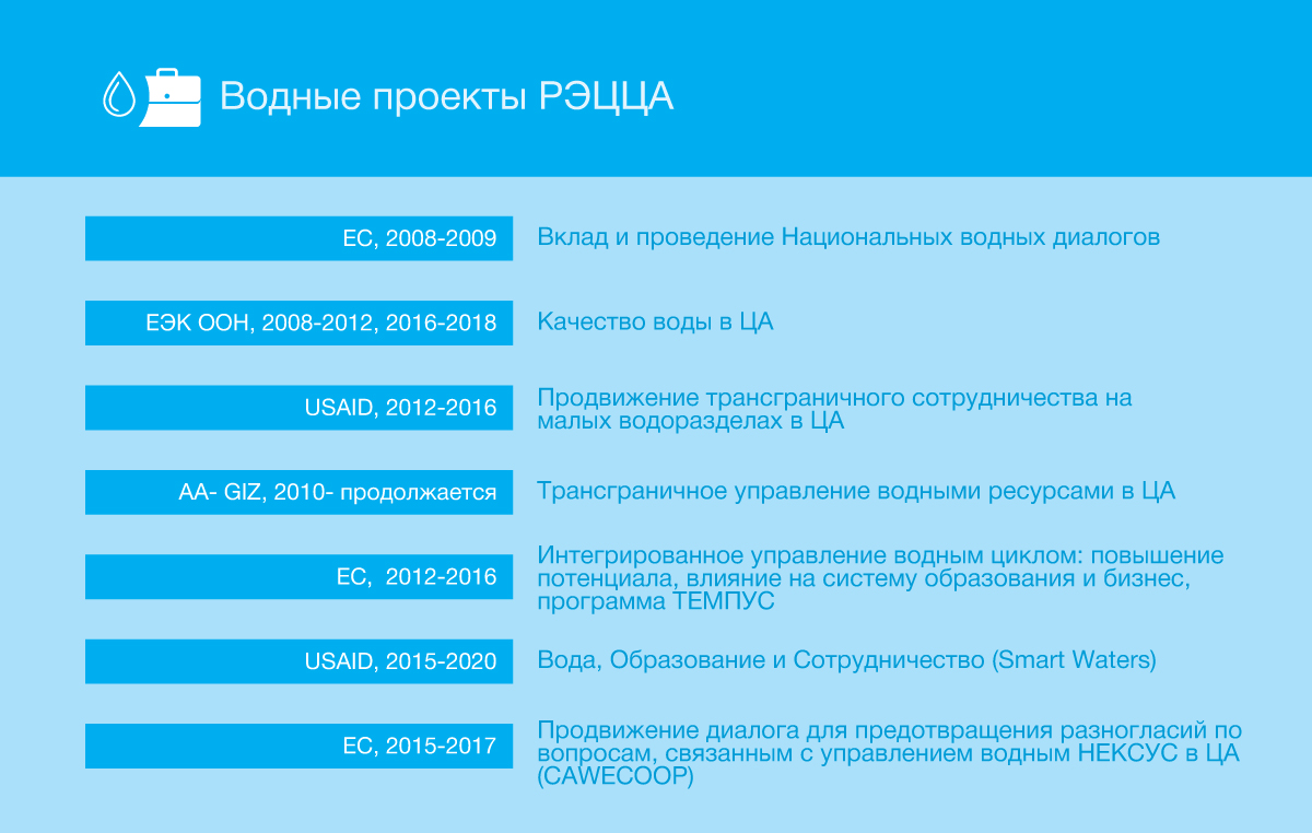 Необходимо отметить, что поддержка водных инициатив является одним из пяти направлений работы Регионального экологического центра Центарльной Азии. За 18 лет работы РЭЦЦА удалось сделать свой вклад в развитие водного сотрудничества в регионе.